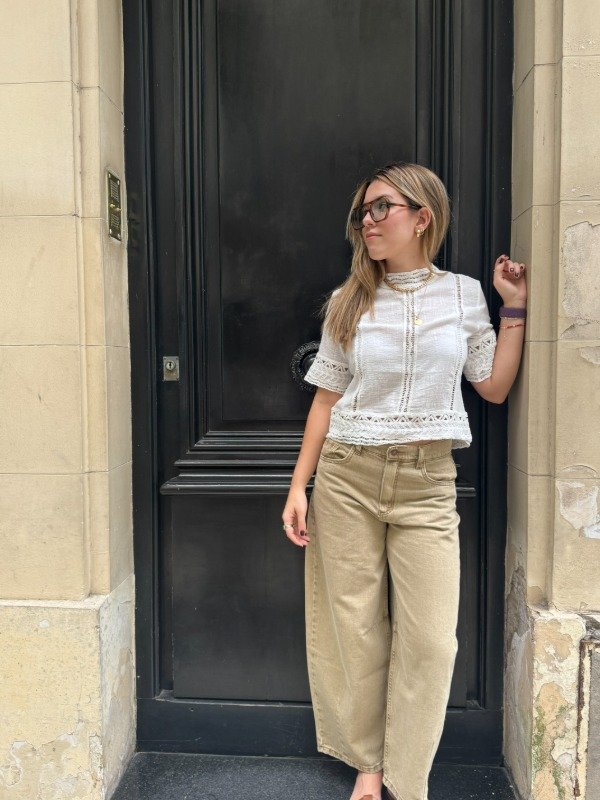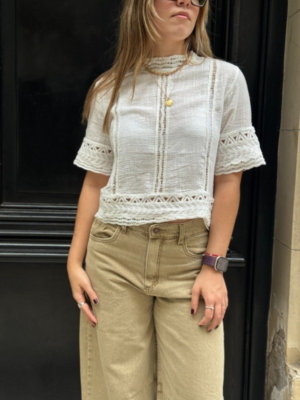 Blusa 100% algodón, fresca y liviana, con alforzas y detalles de puntilla en mangas, escote y bajo base. Terminación recta.